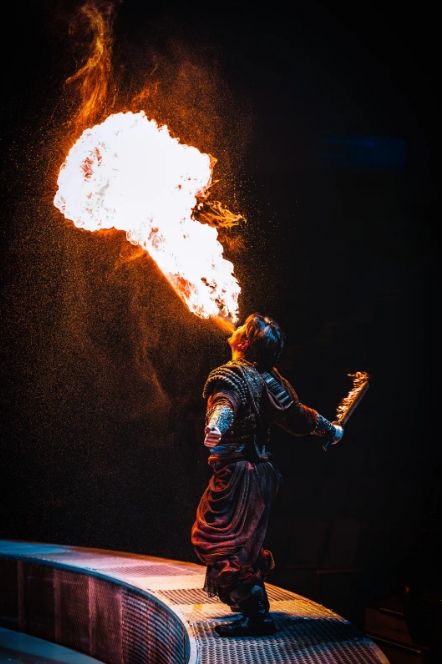 “本次升級,我們采用“天幕地屏+激光投影”的立體舞臺設(shè)計(jì),打破了傳統(tǒng)演出的空間限制,給觀眾帶來前所未有的沉浸式體驗(yàn)?!睂?dǎo)演閔銳接受采訪時說,“《王的戰(zhàn)車》以北方部落的古老傳說為藍(lán)本,將傳統(tǒng)技藝與現(xiàn)代科技巧妙融合。比如縵吊演員的表演象征著部落信仰的升華,而噴火表演則象征著勇士的熾熱斗志。整場演出既保留了傳統(tǒng)雜技的力量與驚險,又通過全息投影技術(shù)等科技手段賦予其全新的藝術(shù)表達(dá),希望觀眾在觀演的過程中,除了感受到震撼,也能體會到中國傳統(tǒng)文化的深厚底蘊(yùn)與傳承。